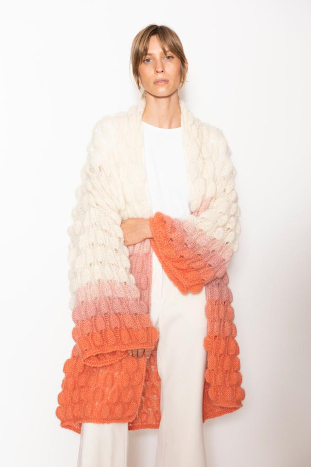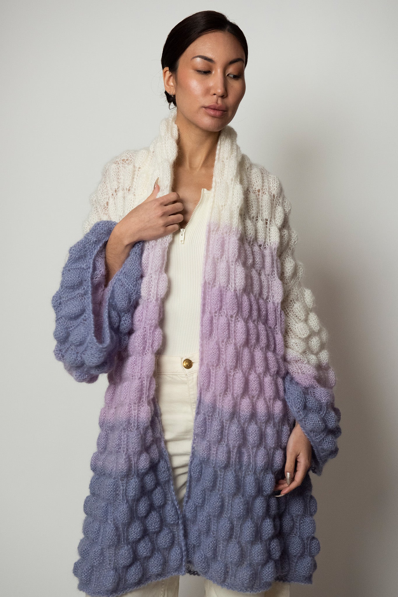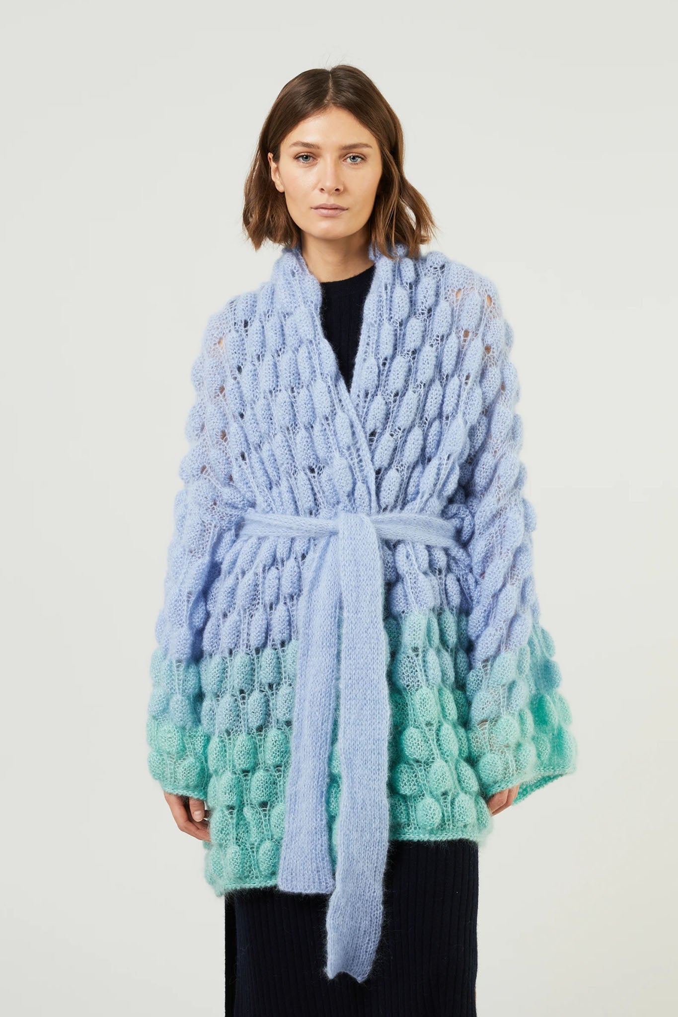 Single Color Gradient option - The order of the gradient will go as followed: the main color will be the top of the coat, and blended towards the bottom of the coat into the color chosen in the single color gradient option. Please refer to Mini Zoe Cashmere coat