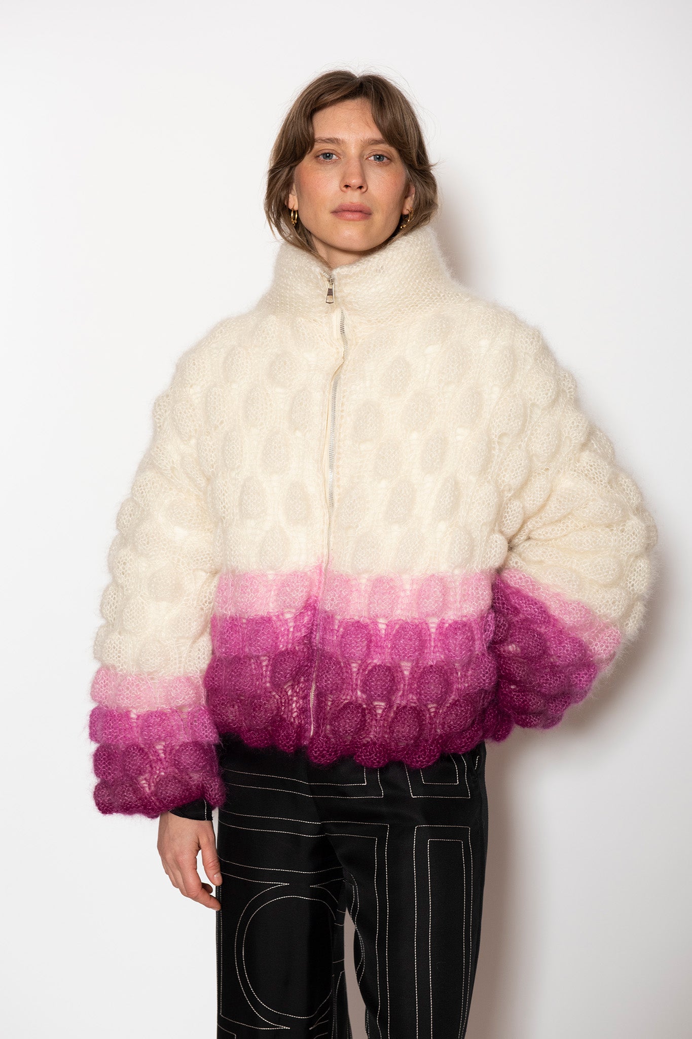 Single Color Gradient option - The order of the gradient will go as followed: the main color will be the top of the coat, and blended towards the bottom of the coat into the color chosen in the single color gradient option. Please refer to Mini Zoe Cashmere coat