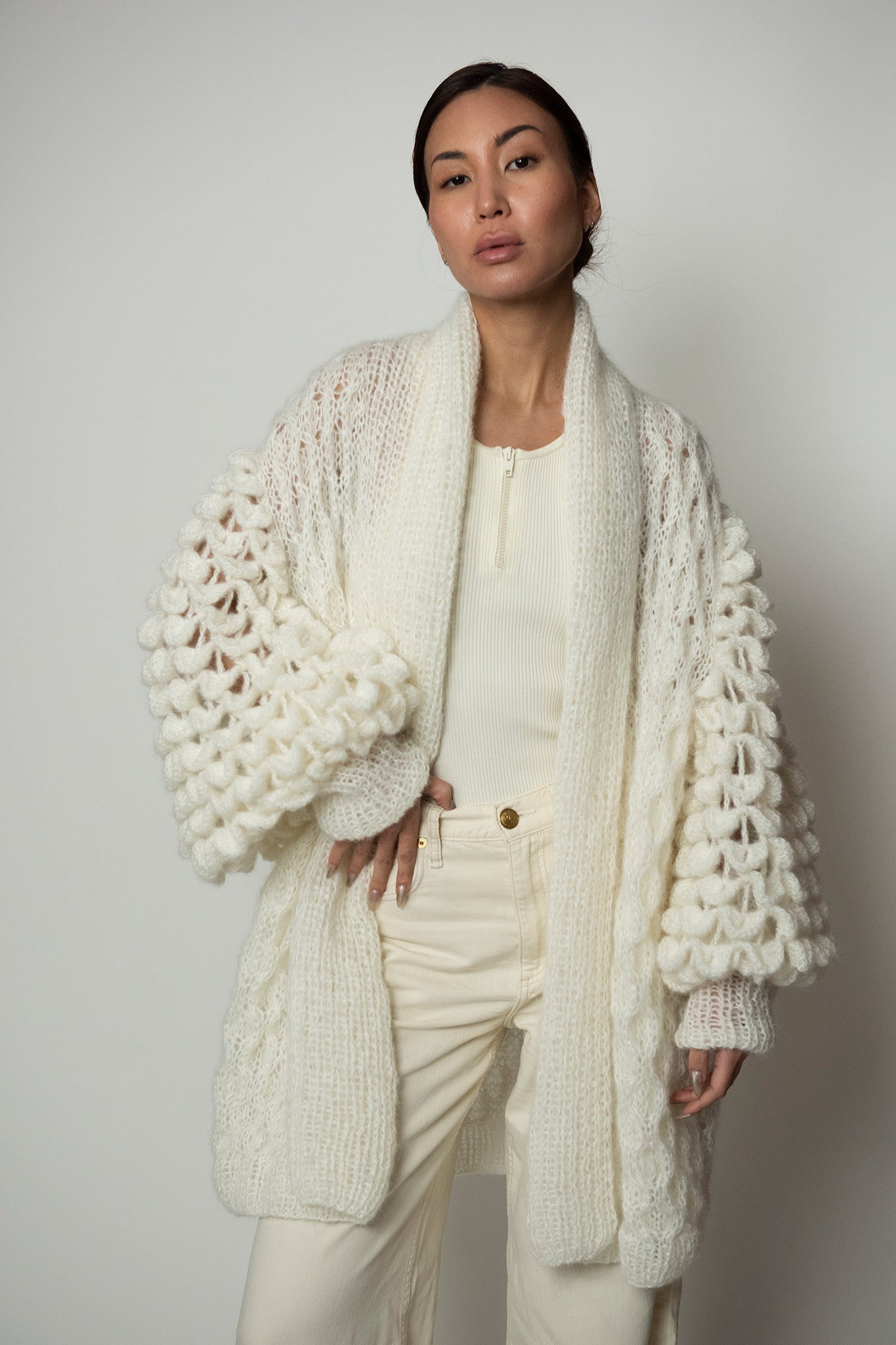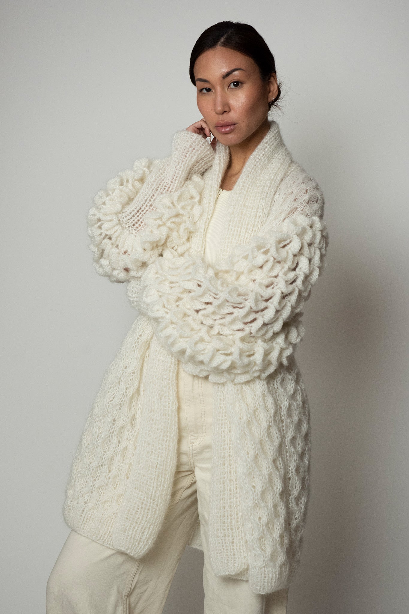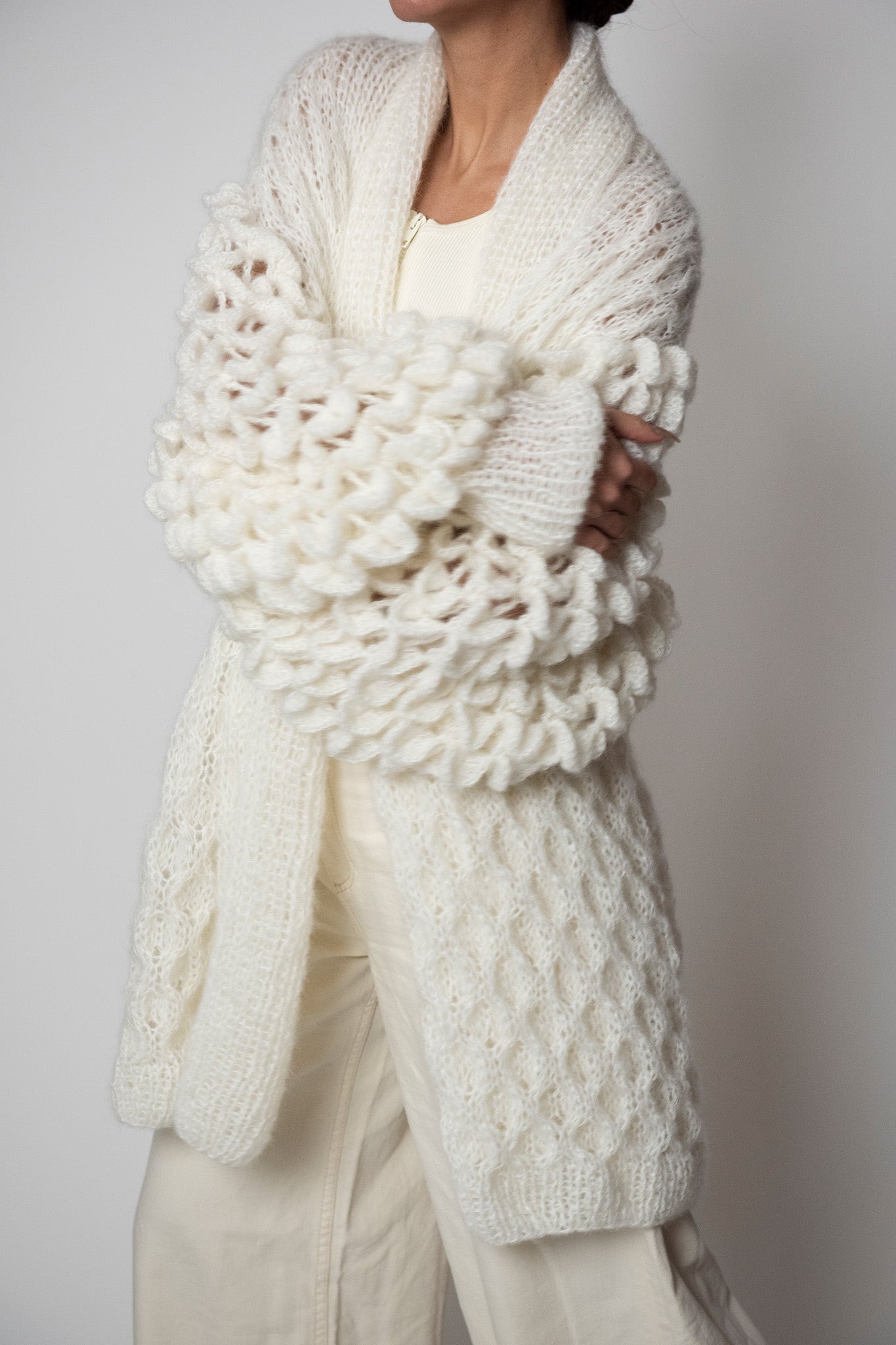 All of our Lace, Mohair and Silk coats are made with 75% Baby Mohair 25% Silk.